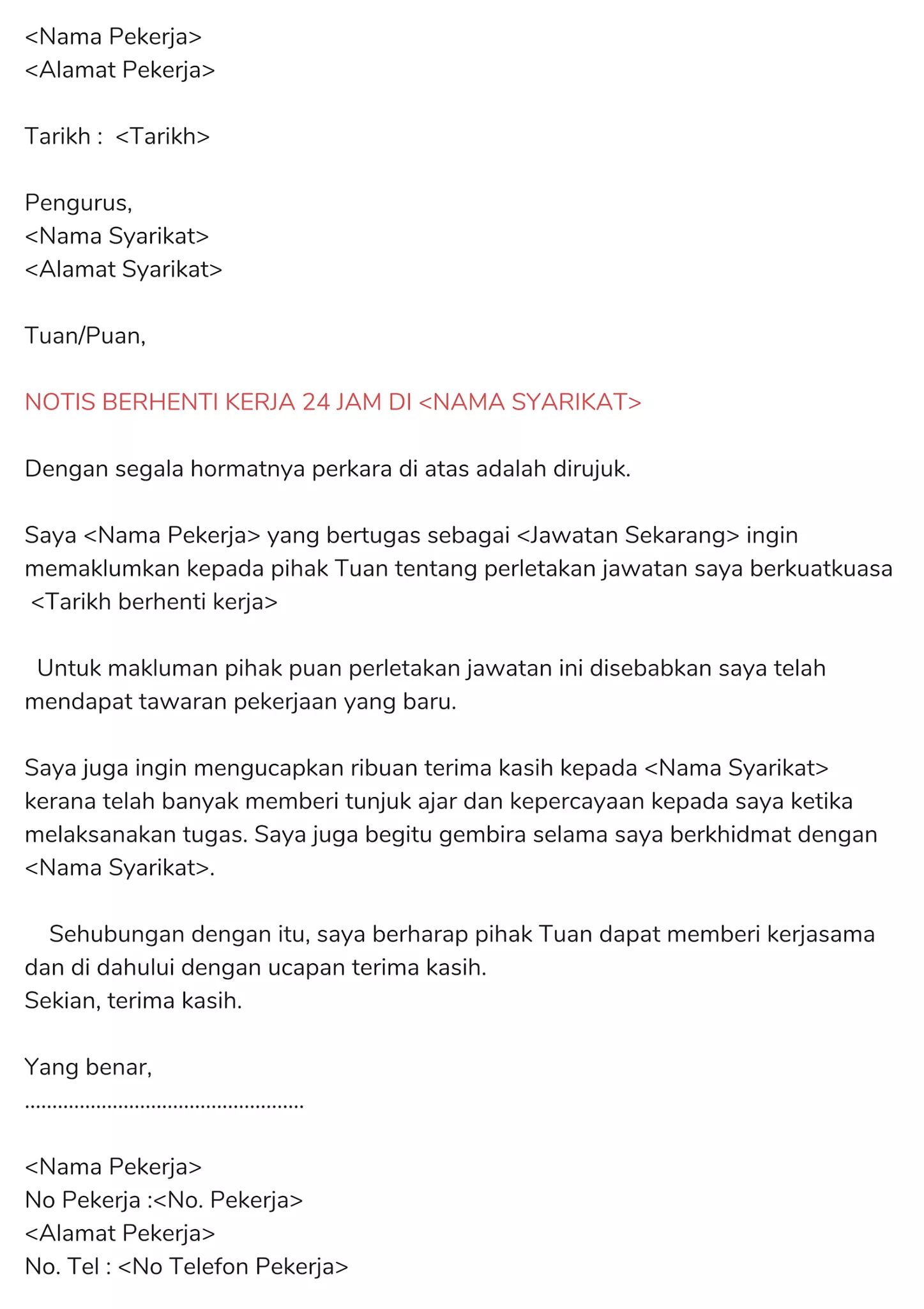 Surat Berhenti Kerja Contoh Rasmi Notis 24 Jam Sebulan