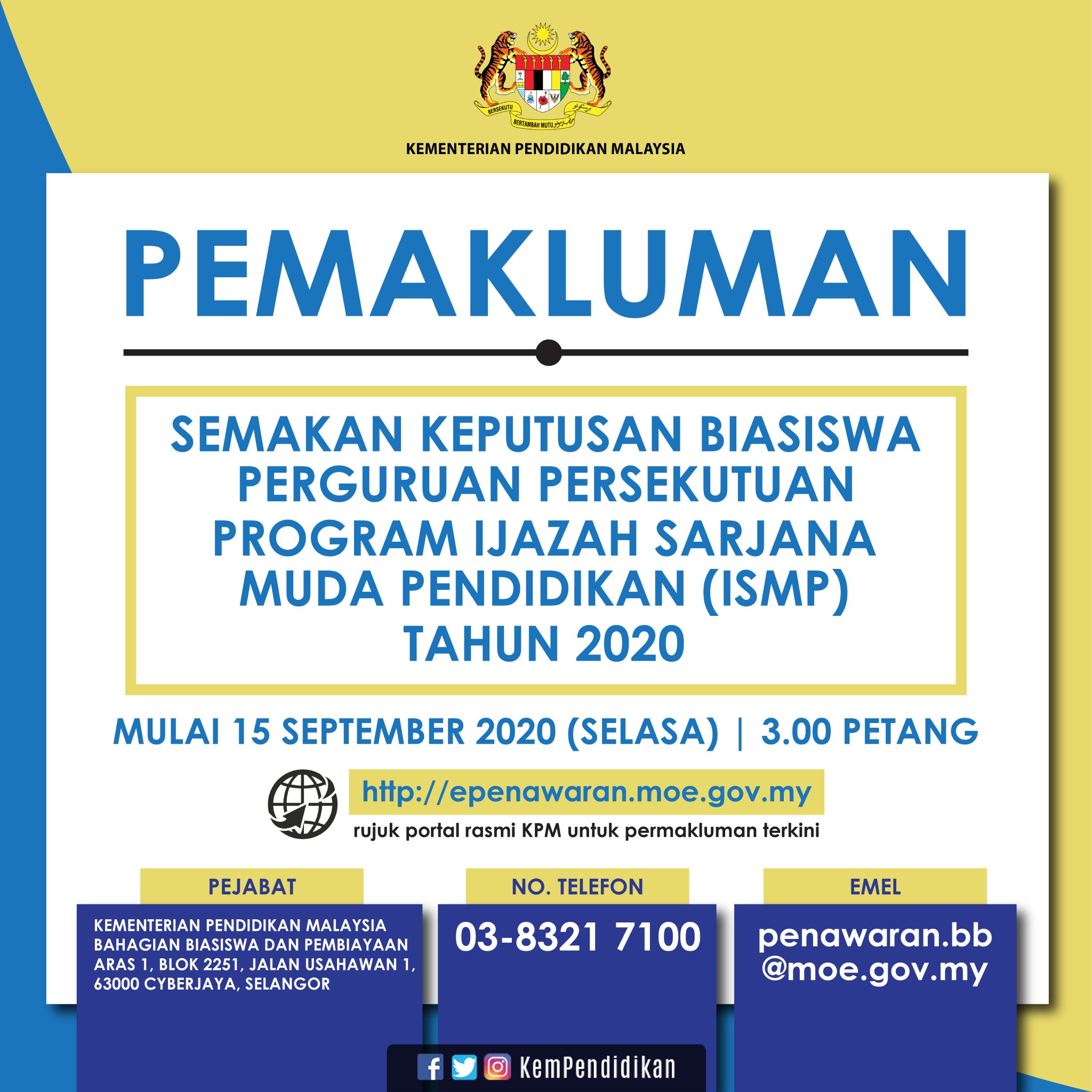 Kpm On Twitter Pemakluman Semakan Keputusan Biasiswa Perguruan Persekutuan Program Ijazah Sarjana Muda Pendidikan Ismp Tahun 2020 Mulai Selasa 15 September 3 00 Petang Sila Layari Pautan Berikut Untuk Melakukan Semakan Keputusan Https T Co