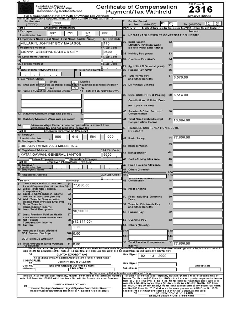 Bir Form 2316 Income Tax Employment