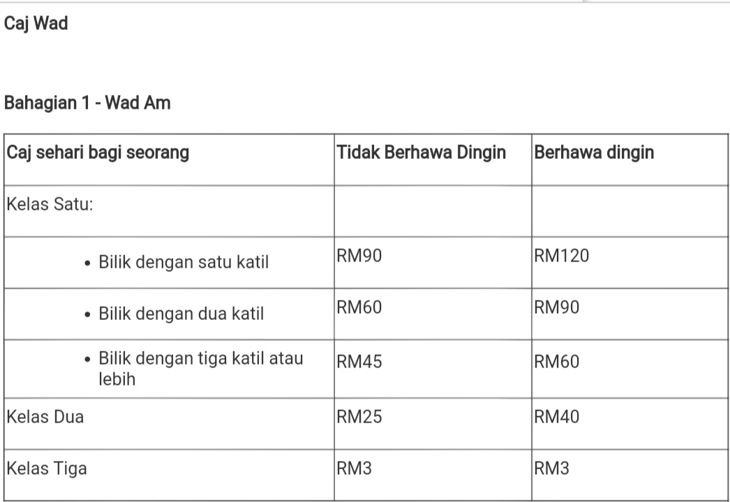 Caj sehari bagi seorang. Tu baru caj penginapan belum caj rawatan prosedur ujian dan lain lain. Termasuk semua jenis rawatan bagi warganegara seperti bayaran wad am wad bersalin fisioterapi dan beberapa rawatan lain manakala kelas 3 caj wad dan rawatan kekal pada kadar lama.