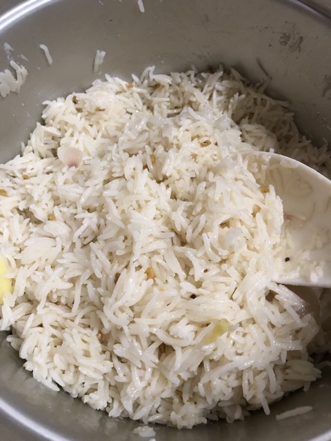 Toskan kedua beras yang direndam dan kukus selama 30 minit. Kita mungkin tak selalu menggunakan beras jenis basmathi kerana beras ini biasanya hanya digunakan untuk membuat menu istimewa seperti nasi minyak atau nasi arab. Gaulkan nasi rata dan tutup apinya.